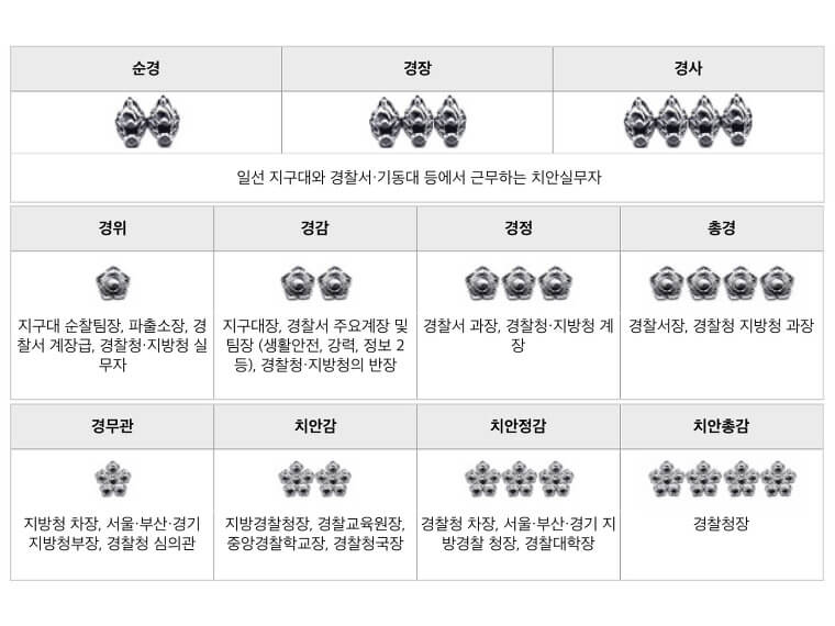 구체적으로 '순경(巡警) – 경장(警長) – 경사(警査)' 등 비간부와 '경위(警衛) – 경감(警監) – 경정(警正) – 총경(總警) – 경무관(警務官) – 치안감(治安監) – 치안정감(治安正監) – 치안총감(治安總監, 경찰청장)' 등 간부로 나눠집니다.