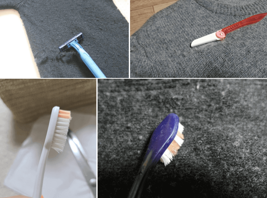 만일 옷감의 손상이 염려된다면 안전한 도구를 사용해야 하는데 참빗이나 브러시, 솔, 낡은 칫솔, 눈썹 정리용 칼, 뒤꿈치 각질 제거용 돌 등을 이용해 안전하게 보풀 제거를 할 수 있습니다.