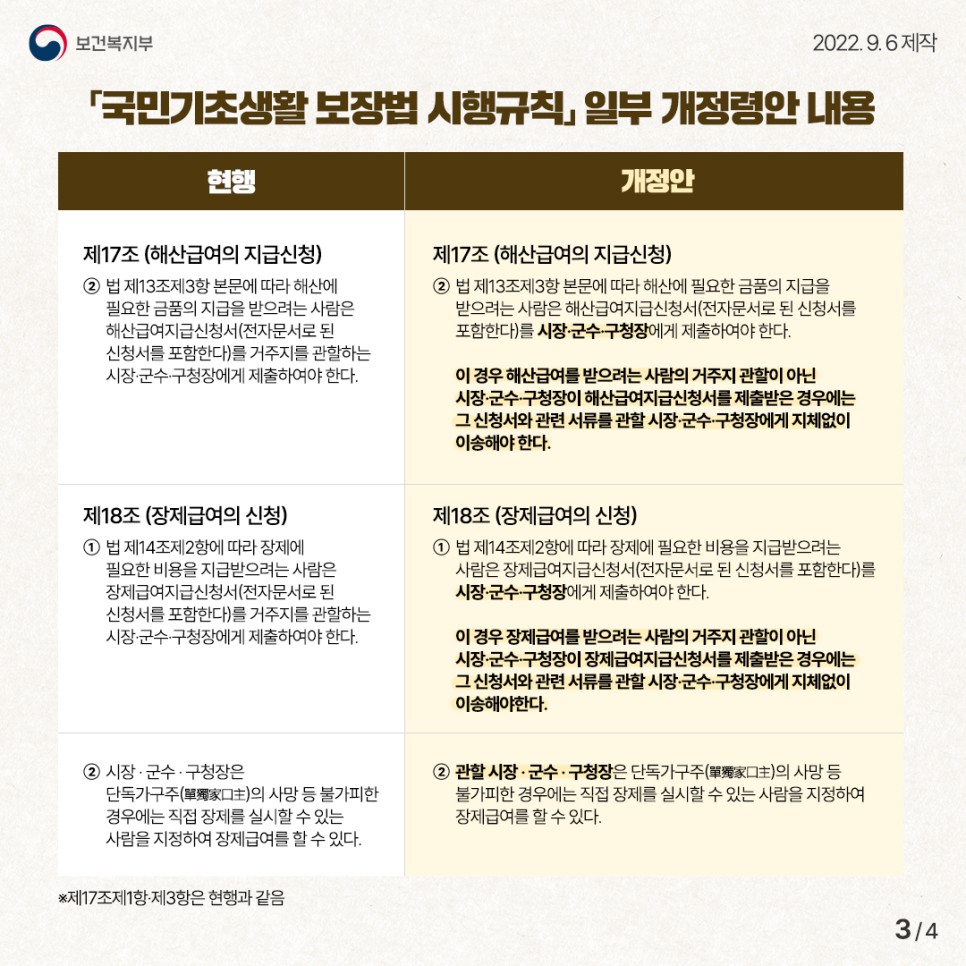 이번 국민기초생활 보장법 시행규칙 개정으로 그동안 해산급여와 장제급여 신청을 위해 반드시 거주지에서 신청해야 했던 것을 전국 어디서든 신청할 수 있도록 바뀌어 많은 불편이 해소될 것입니다.