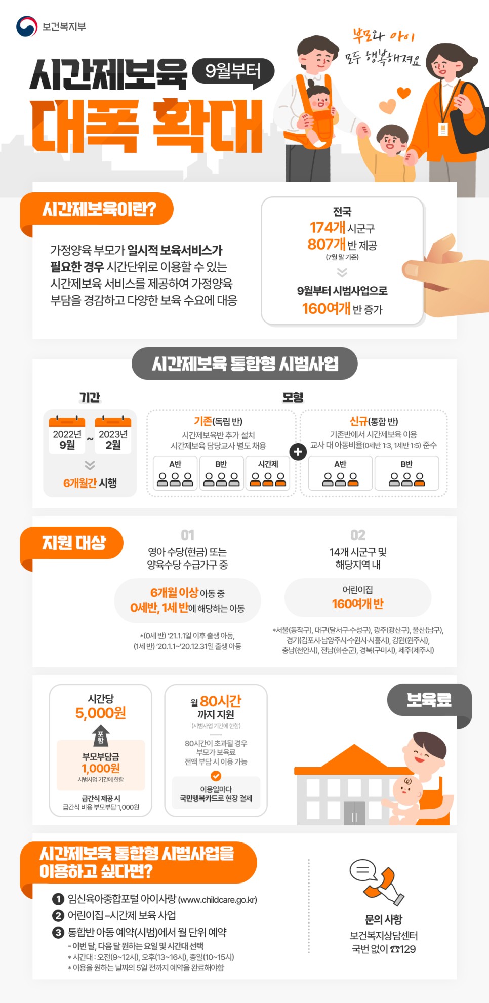 올해 7월 말 기준, 전국 174개 시·군·구, 807개 반에서 시간제보육 서비스를 제공하고 있으며, 이번 통합형 시범사업으로 1개 시·군·구(전남 화순군)가 시간제보육을 제공하는 지역으로 추가되고 160개 반이 증가합니다.